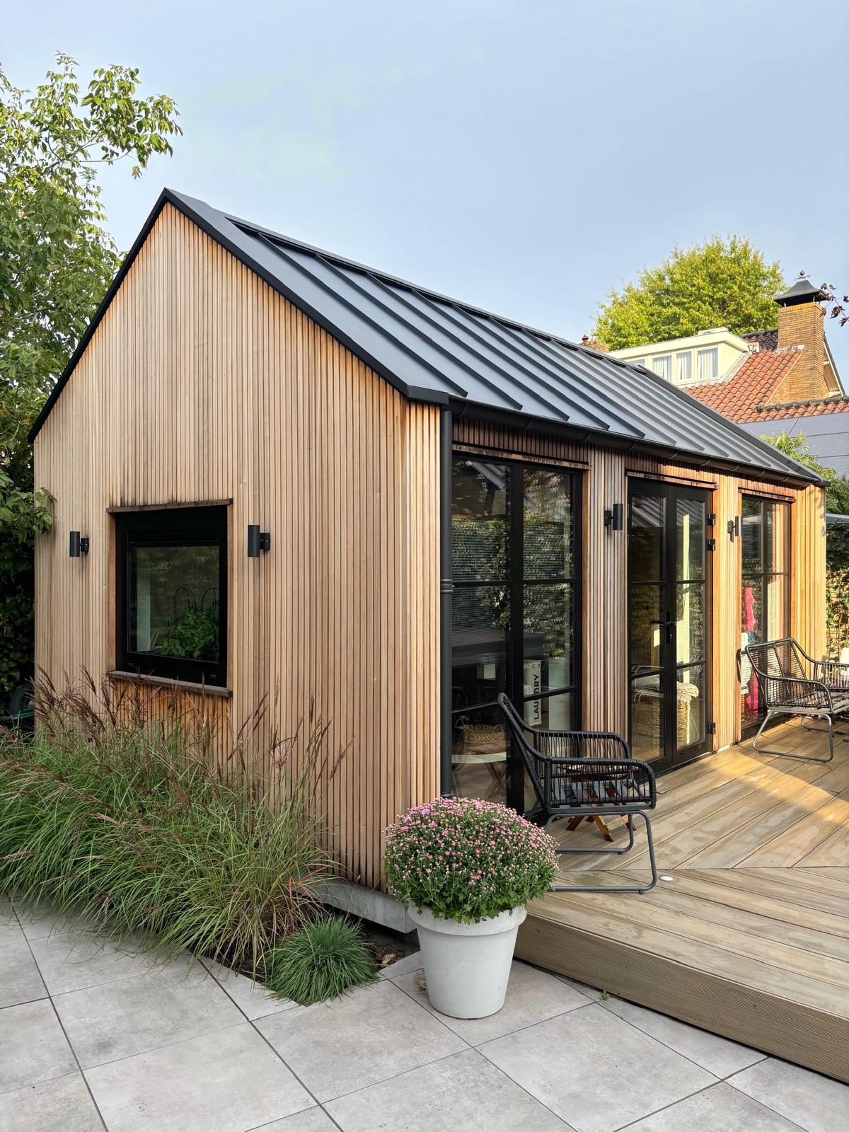 In Huizen realiseerden we dit luxe, compacte huisje met een moderne en minimalistische uitstraling. De gevel is bekleed met strak geprofileerd Ayous, een duurzame houtsoort met een warme uitstraling en een lange levensduur. Het dak is voorzien van gefelste staalplaten voor een strak lijnenspel en een onderhoudsvriendelijke afwerking. Dankzij de aluminium kozijnen in diepzwart krijgt het geheel een architectonische uitstraling die perfect past bij een moderne tuinomgeving.